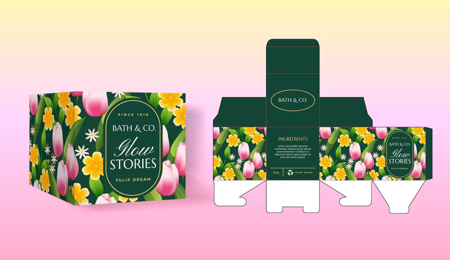A vibrant, professionally designed box created for Bath & Co.’s “Glow Stories – Tulip Dream” collection. This packaging features a bold floral pattern, custom dieline layout, and print-ready files tailored for shelf appeal and brand storytelling. This project is a sample of our Packaging Design & Box Designing service, where we craft fully customized, brand-aligned designs for cosmetics, food, wellness, and retail products. Delivered digitally as: